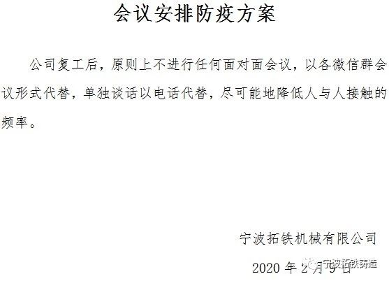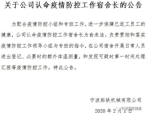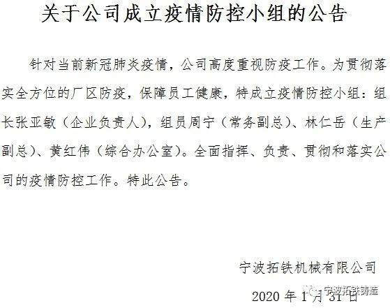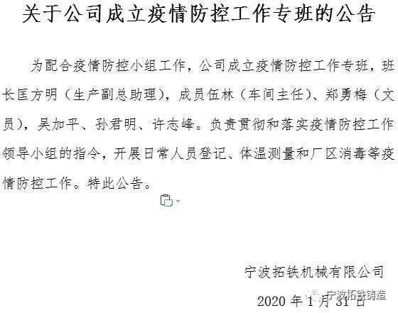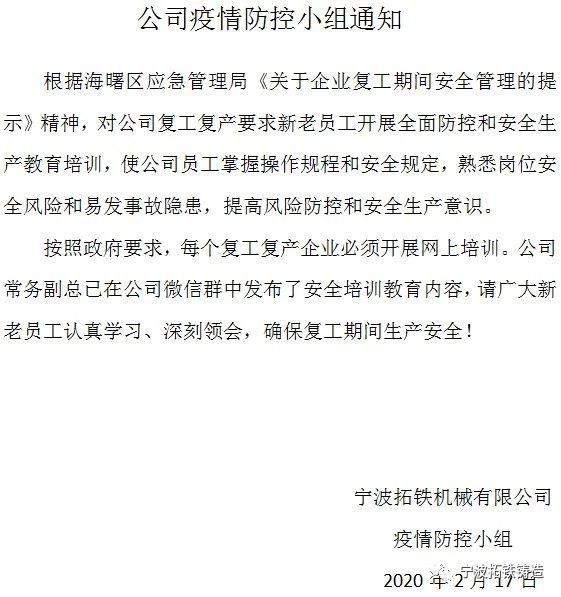 我們共同期望本次疫情立即解除,百姓安康、國家昌盛。相信風雨后總會有彩虹。我們在此再次呼吁拓鐵的全體員工們,一定要牢記和貫徹政府與公司的疫情防控原則,眾志成城,一起打贏本次的疫情戰。