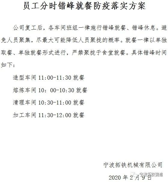 早在拓鐵復工之前,公司成立的疫情防控小組和專班成員就已落實大量防疫工作,確保員工們身體健康和生活生產的合理合規。例如:設立隔離區及隔離人員專用廁所,以防萬一;落實門衛、洗衣間、宿舍、食堂、行政樓、車間等區域的日常消殺規程;設立廢舊口罩回收桶和疫情防控信息宣傳欄;落實“一人一食”用餐規程等等。
